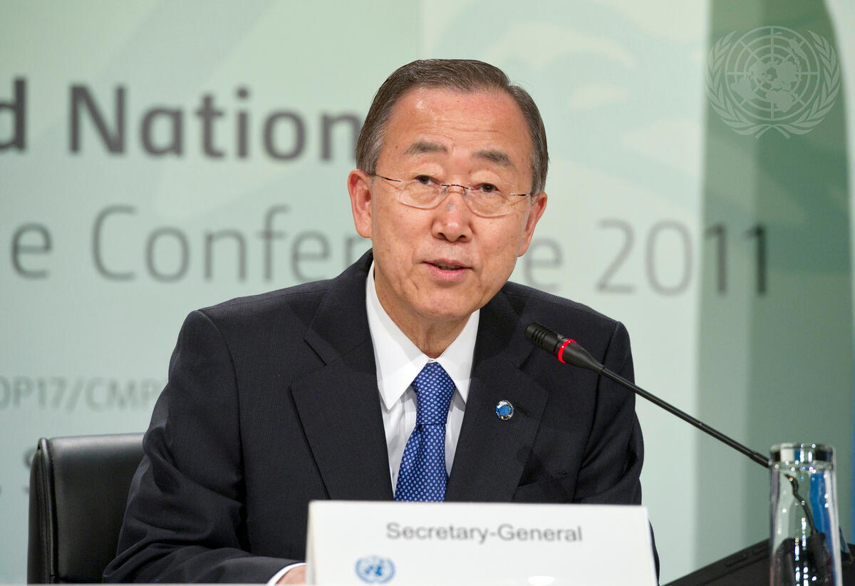 Secretary-General Ban Ki-moon briefs the press following his remarks to the high-level segment of the COP17/CMP7 UN Climate Change Conference in Durban, South Africa. Mr. Ban was joined by Christiana Figueres, Executive Secretary of the UN Framework Convention on Climate Change (UNFCCC).