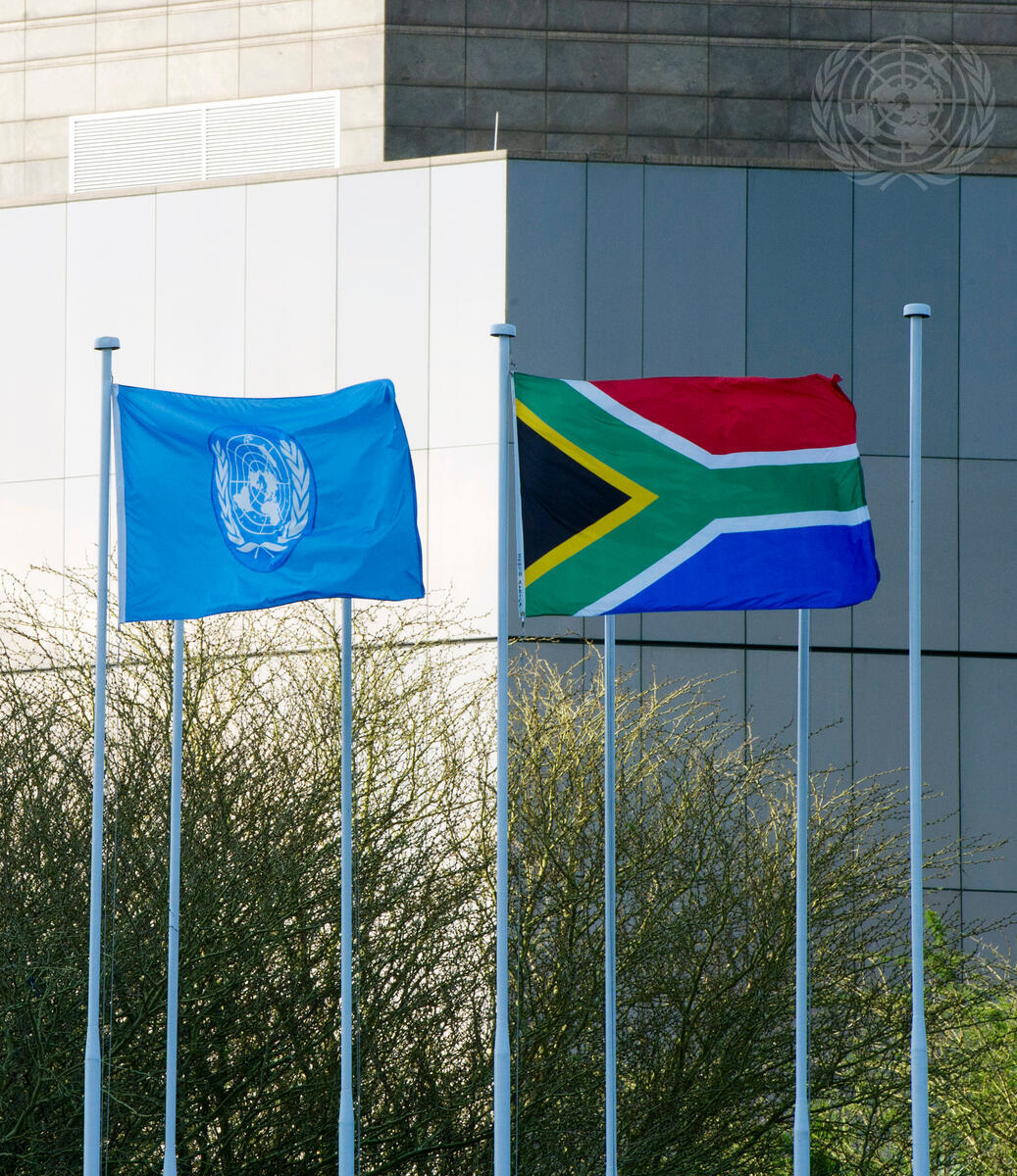 The flags of the United Nations and the Republic of South Africa on the opening day of the high-level segment of the COP17/CMP7 UN Climate Change Conference, outside the Inkosi Albert Luthuli International Convention Centre in Durban, South Africa.