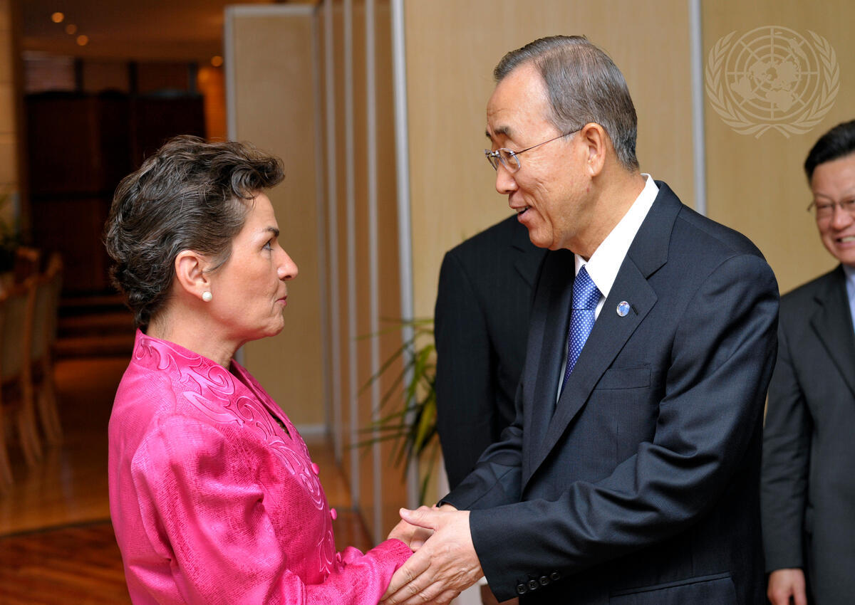 Secretary-General Ban Ki-moon (right) arrives at a luncheon briefing with Christiana Figueres, Executive Secretary of the UN Framework Convention on Climate Change (UNFCCC), during the UN Climate Change Conference in Durban, South Africa (referred to as COP17/CMP7).