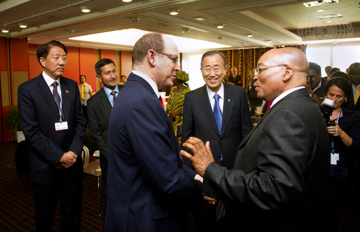 Jacob Zuma (right), President of South Africa, greets Prince Albert II of Monaco, on the sidelines of the COP17/CMP7 UN Climate Change Conference in Durban, South Africa. Pictured between them is Secretary-General Ban Ki-moon and at right, Chee Hean Teo, Deputy Prime Minister, Coordinating Minister for National Security and Minister for Home Affairs of Singapore.