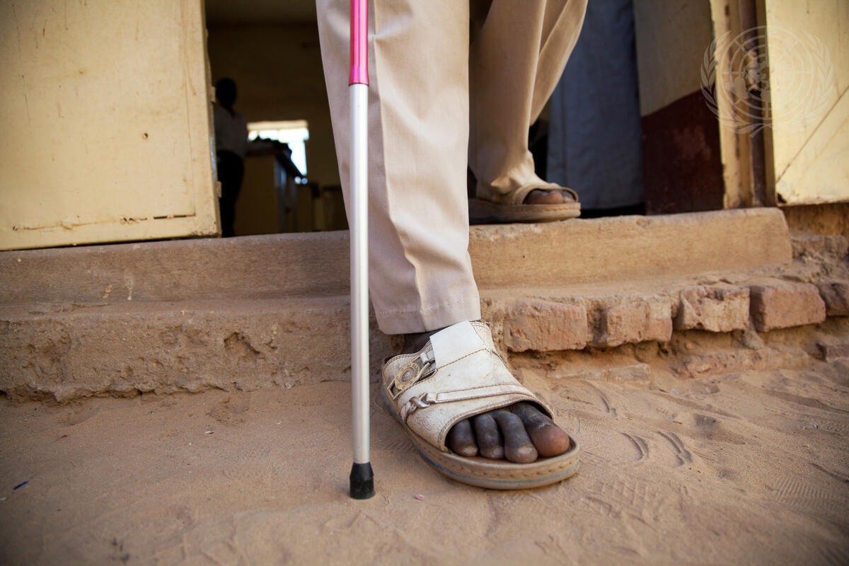 Nineteen-year-old Matar Abdallah Adam, who is blind, walks with the help of a walking stick at the centre run by the Sudanese Association for Disabled People in El Fasher, North Darfur. The organization assists persons with disabilities across Darfur.