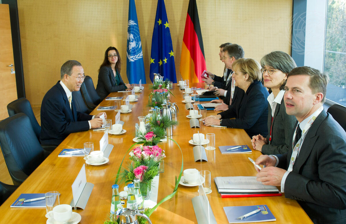 Secretary-General Ban Ki-moon (left) meets with Angela Merkel (third from right), Chancellor of Germany, in Bonn, where the International Afghanistan Conference takes place today.
