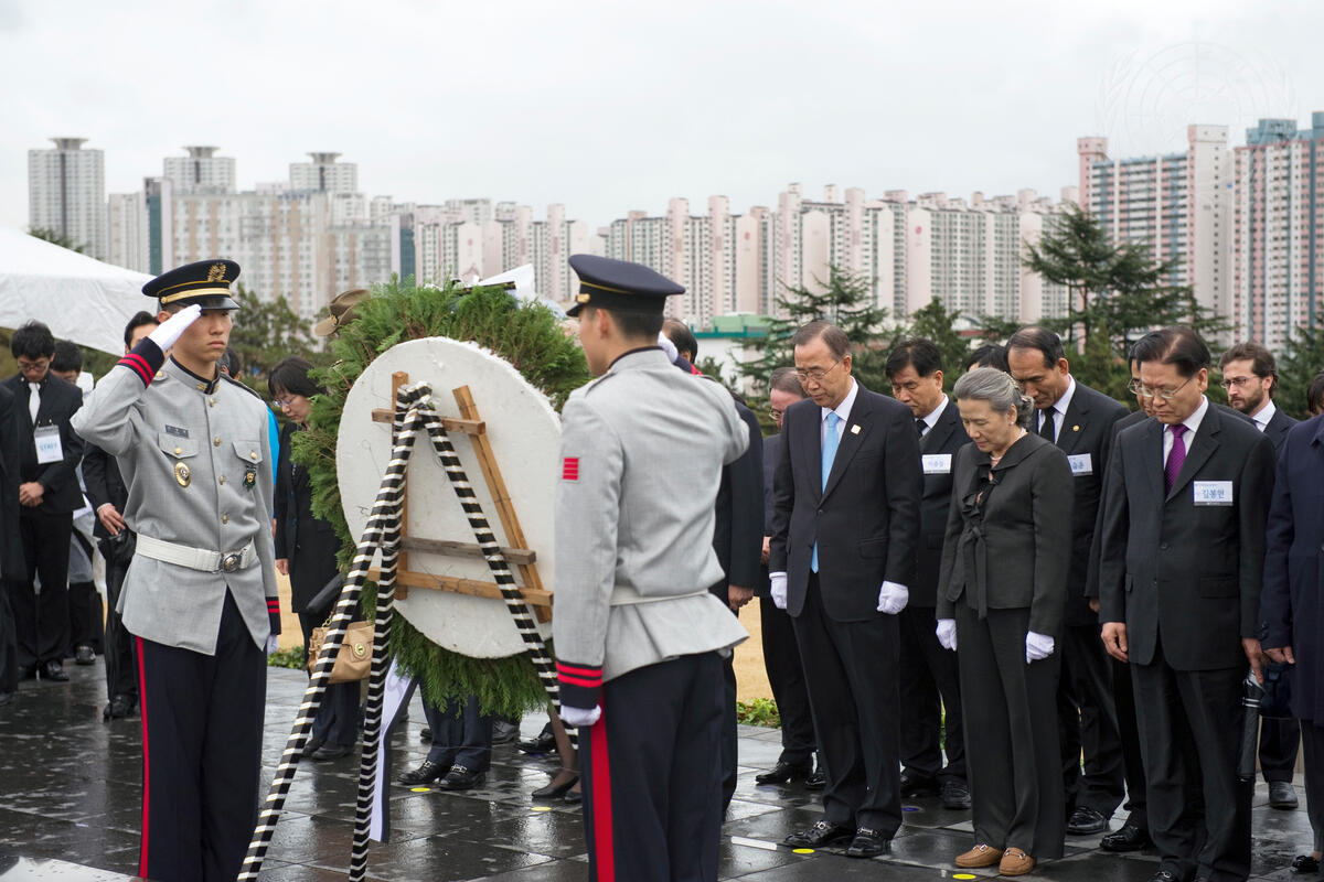 Secretary-General Ban Ki-moon (left, in blue tie) and his wife, Yoo Soon-taek (second from left), pay their respects at the UN Memorial Cemetery in Busan, Republic of Korea. The only cemetery in the world under the aegis of the United Nations, it honours international UN troops who lost their lives fighting for freedom and peace during the Korean War.