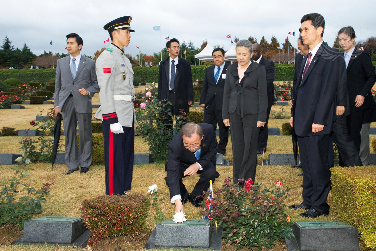 Secretary-General Ban Ki-moon, accompanied by his wife, Yoo Soon-taek (right of Mr. Ban), lays flowers at a grave site at the UN Memorial Cemetery in Busan, Republic of Korea.