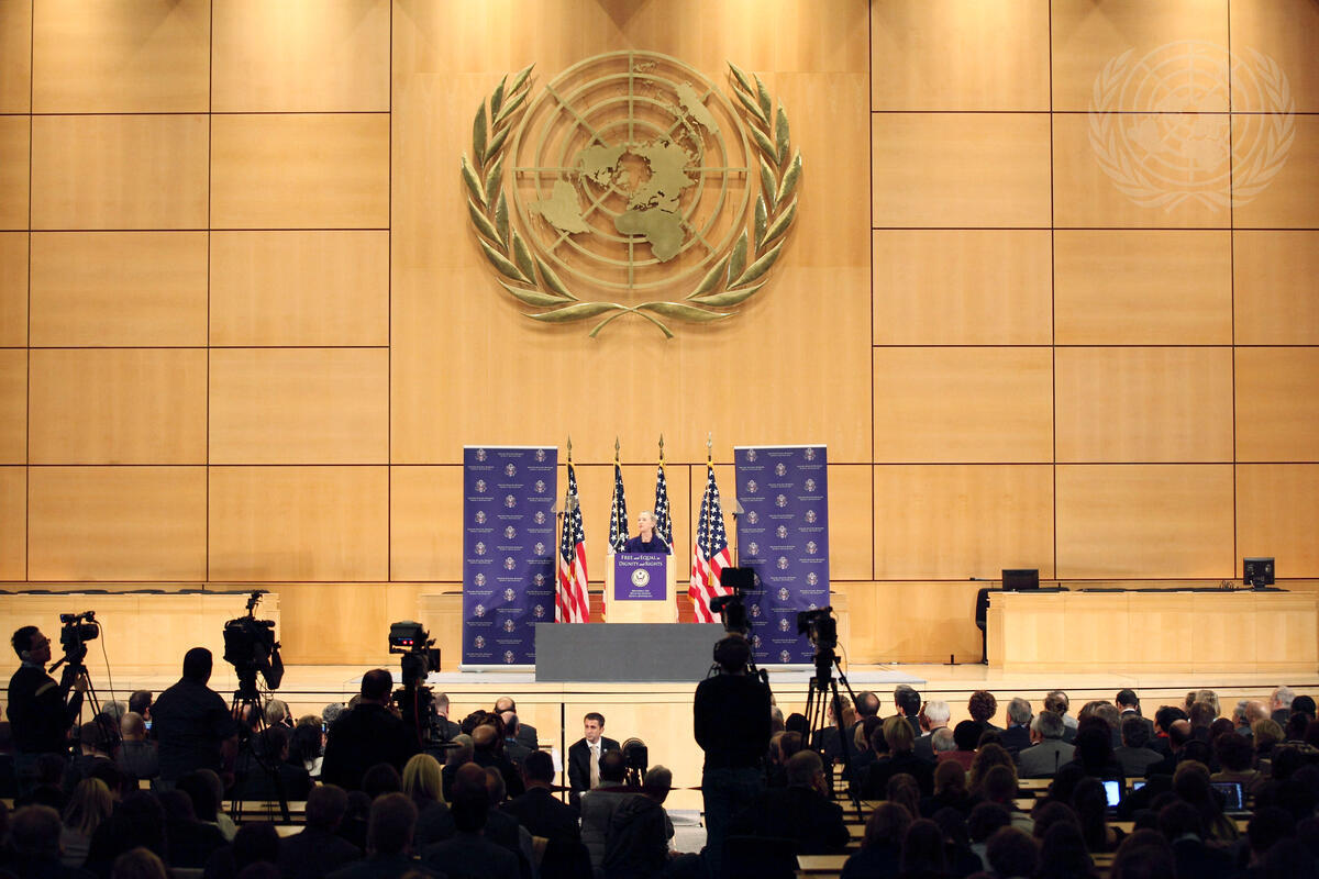 Hillary Rodham Clinton, Secretary of State of the United States of America, delivers a speech on human rights in the main Assembly Hall at the UN’s headquarters in Geneva, Switzerland.