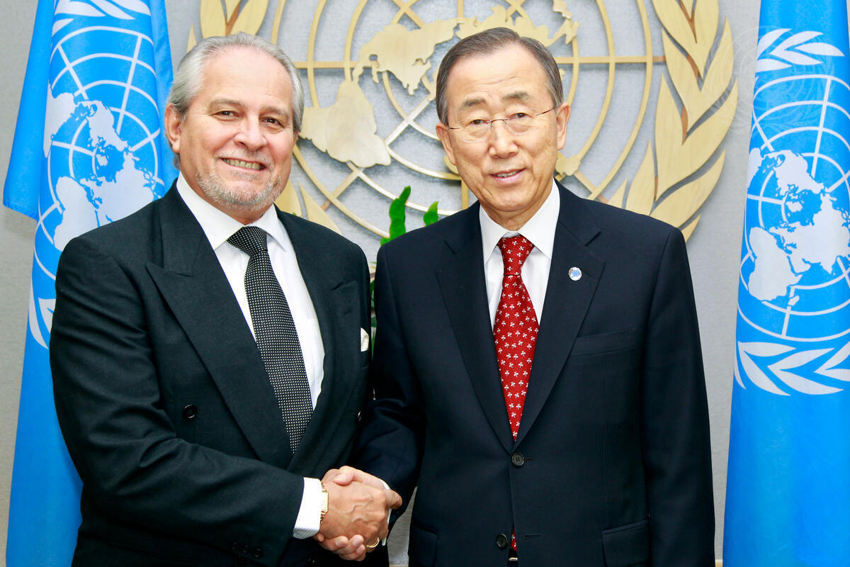 Secretary-General Ban Ki-moon (right) meets with Enrique Roman-Morey, Permanent Representative of Peru to the UN.