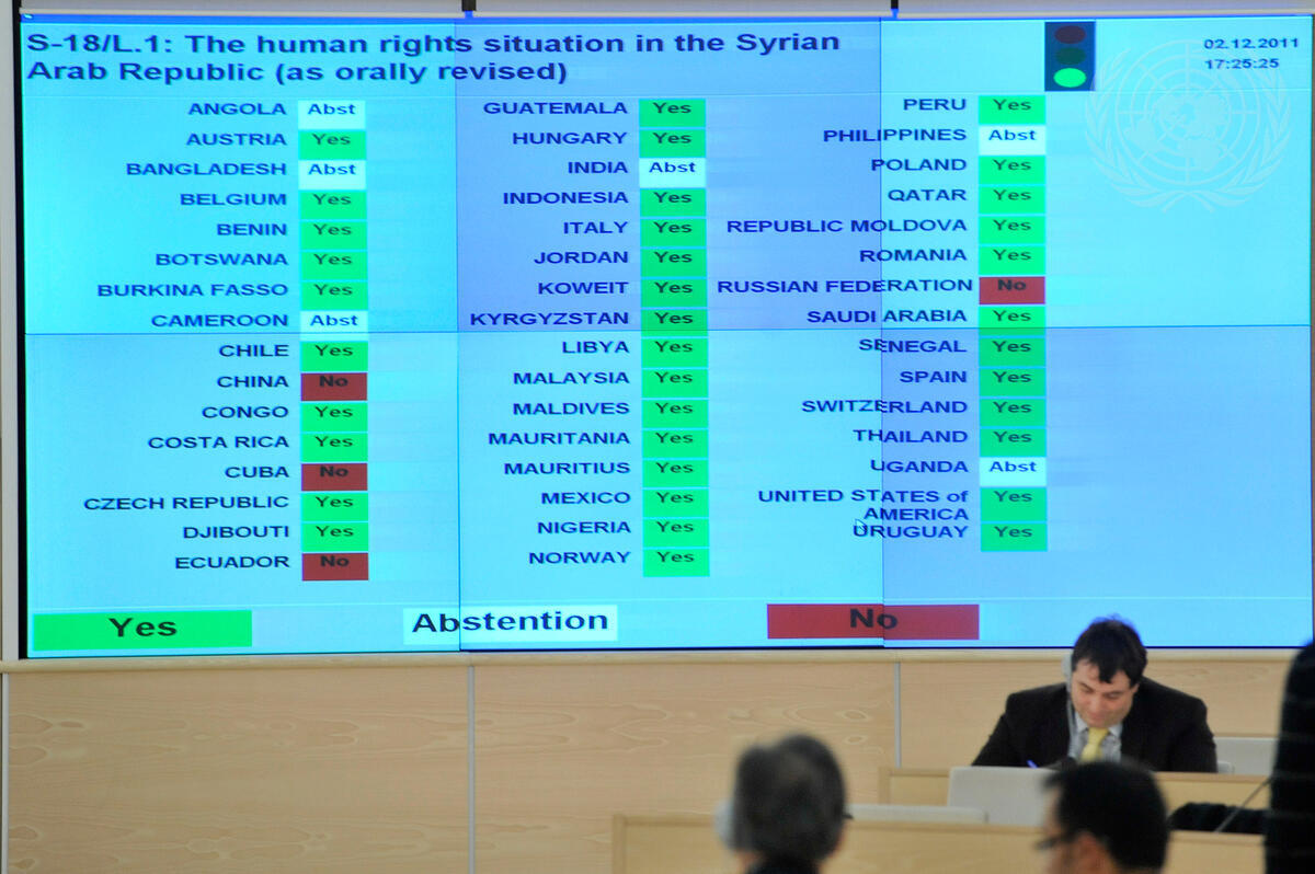 Screens display the vote count on the 47-member Human Rights Council’s draft resolution condemning “gross and systematic"" violations of human rights in Syria. The Council adopted the resolution, with 37 votes in favour, 4 against and 6 abstentions.