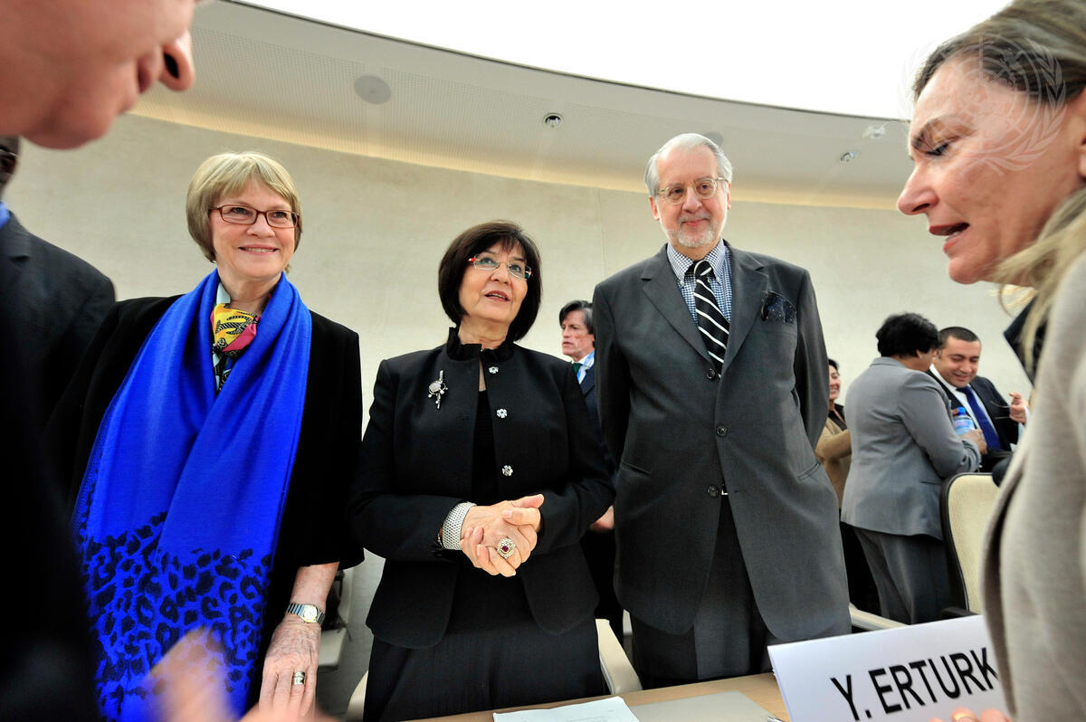 The three-member Human Rights Council Independent Commission of Inquiry on Syria are pictured during a special session of the Council, at which Members overwhelmingly voted to adopt a resolution condemning Syrian authorities' “gross and systematic” violations of human rights. From left: Karen Koning Abu Zayd; Yakin Ertürk; and Paulo Pinheiro, Chair of the Commission.