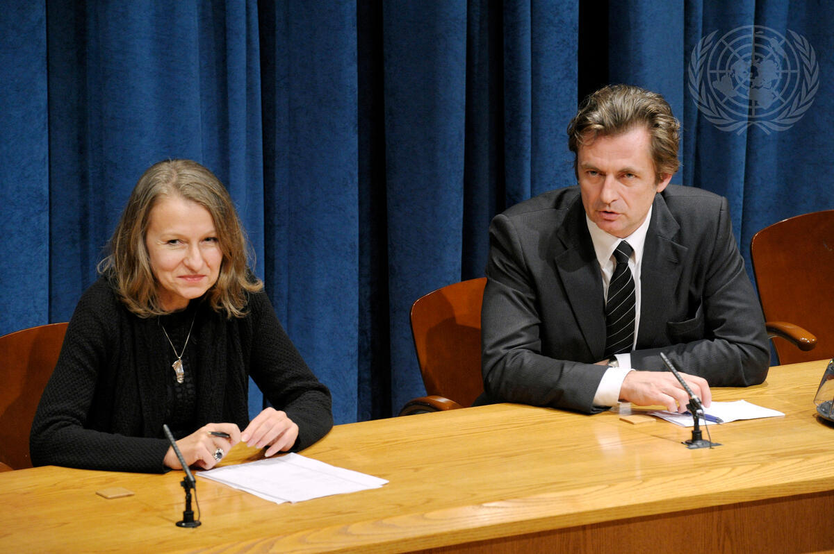 Christian Wenaweser (right), Permanent Representative of Liechtenstein to the UN and President of the Assembly of States Parties to the Rome Statute of the International Criminal Court (ICC), briefs correspondents on the Assembly’s upcoming tenth session at UN Headquarters (beginning 12 December). At left is Tiina Intelmann, Mr. Wenaweser's successor as Assembly President.