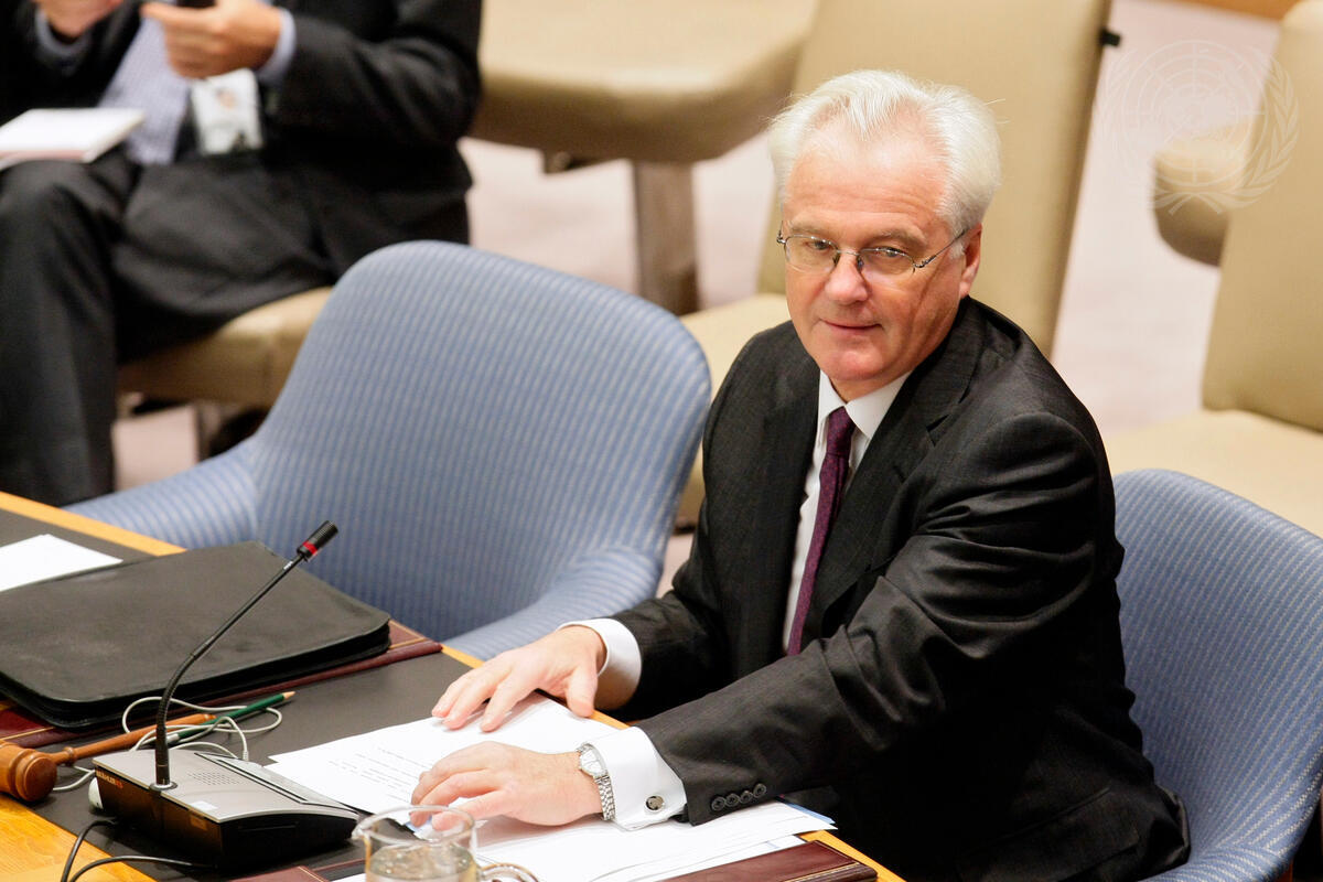 Vitaly I. Churkin, Permanent Representative of the Russian Federation to the UN and President of the Security Council for December, chairs a meeting of the Council at which Members unanimously adopted resolution 2022 (2011), extending the mandate of the UN Support Mission in Libya (UNSMIL) until 16 March 2012.