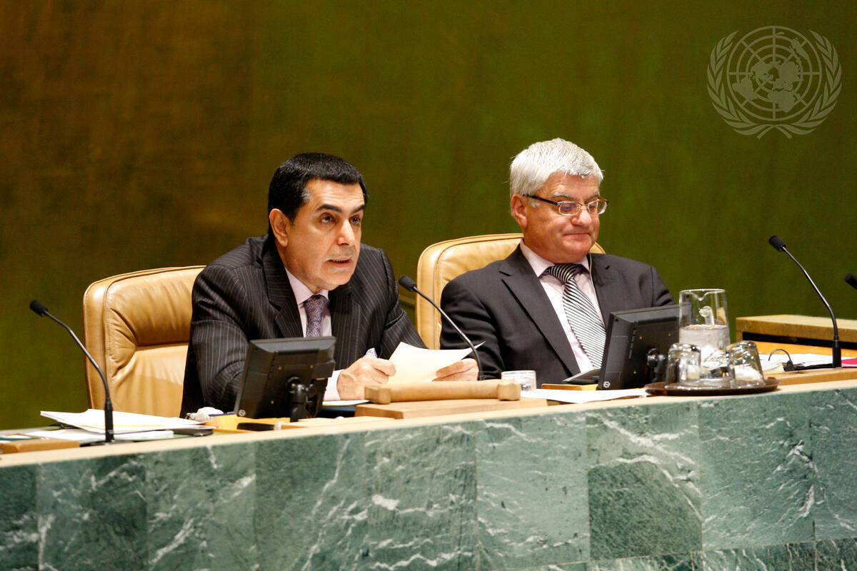 Nassir Abdulaziz Al-Nasser (left), President of the sixty-sixth session of the General Assembly, chairs the Assembly’s annual debate on the “question of Palestine. At right is Ion Botnaru, Director of the General Assembly and the Economic and Social Council (ECOSOC) Affairs Division.