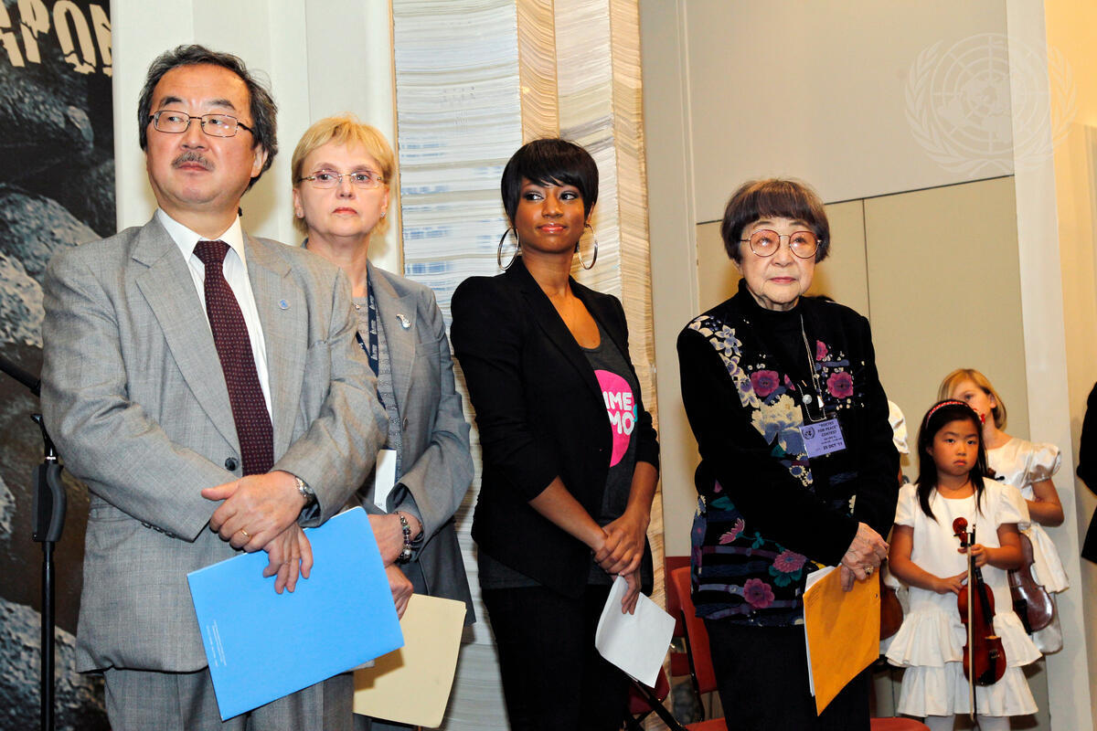 Kiyotaka Akasaka (left), Head of the Department of Public Information (DPI), co-hosts a special event organized by DPI and the UN Office for Disarmament Affairs (UNODA) commemorating Disarmament Week (annually 24-30 October) and the legacy of Hibakusha, the survivors of the atomic bombings in Hiroshima and Nagasaki. With him are event participants (from left) Hannelore Hoppe, Director and Deputy to the High Representative for Disarmament Affairs; Monique Coleman, UN Champion for Youth; and a Hibakusha.