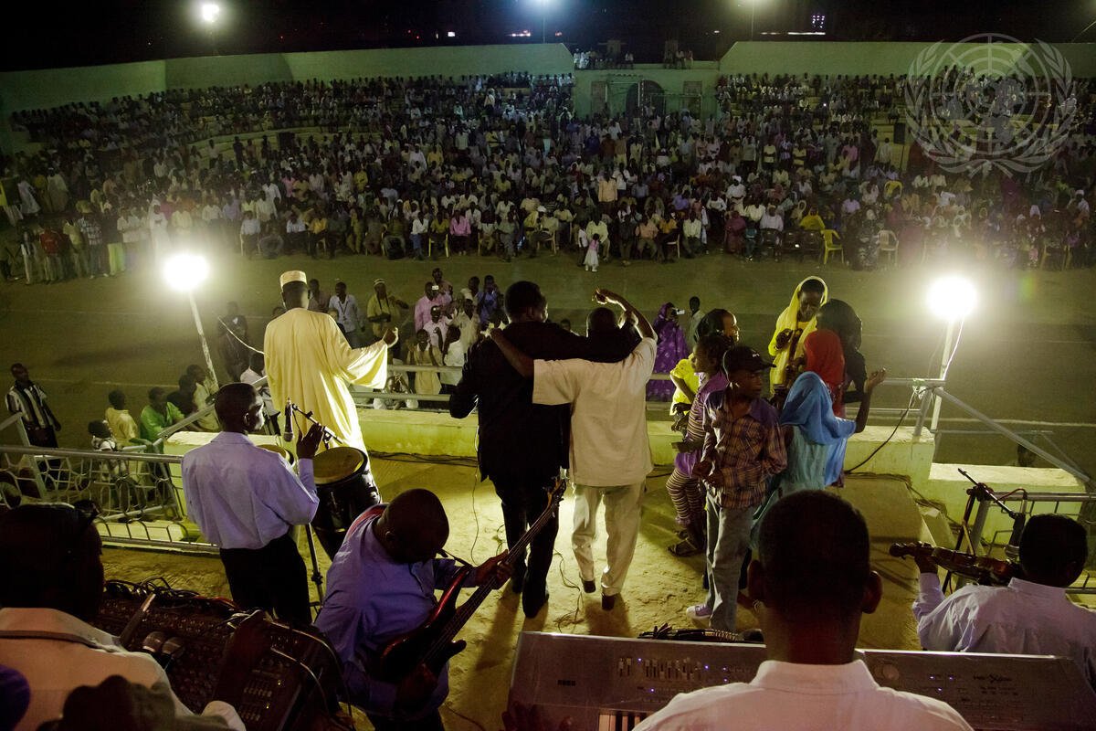 Sudanese singer Omer Ihsas (back to camera, in black) and fellow entertainers give a first-ever performance of Ihsas’ song, “New Era”, during UN Day celebrations at Al Zubier Volleyball Stadium in El Fasher, North Darfur. The UN Day event, commemorating the sixty-sixth anniversary of the birth of the United Nations, was organized by the African Union-UN Hybrid Operation in Darfur (UNAMID).