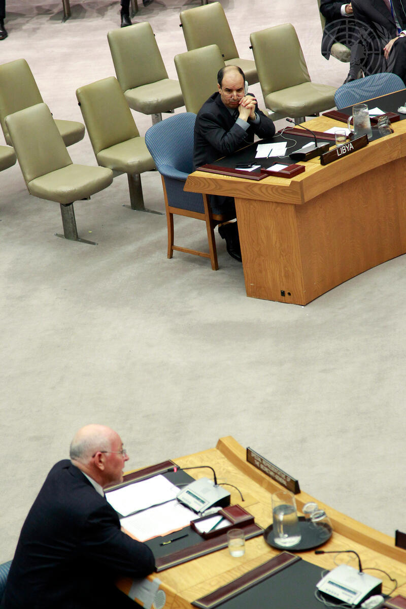 Ibrahim O. A. Dabbashi (top), Representative of Libya, listens as Ian Martin (below), Special Representative of the Secretary-General for Libya and Head of the UN mission in that country (UNSMIL), briefs the Security Council. On 23 October Libya formally declared liberation, bringing to a close four decades of dictatorship under Muammar al-Qadhafi and what Mr. Martin called ""a long and painful chapter” in the country’s history.