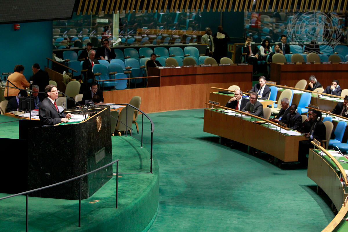 Bruno Rodríguez Parrilla (at podium), Minister for Foreign Affairs of Cuba, addresses the General Assembly at its annual consideration of a draft resolution on ending the economic, commercial and financial embargo imposed by the United States on Cuba. For the 20th straight year, the Assembly voted overwhelmingly in favour of the resolution, with 3 Members (Marshall Islands, Micronesia, and Palau) abstaining and 2 (Israel and the United States) voting against. Pictured at the frontmost table is the delegation from the United States.