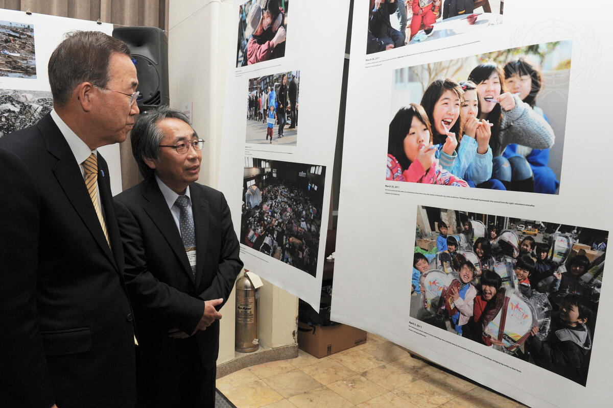 Secretary-General Ban Ki-moon (left) sees the UN Headquarters exhibit, “The Great East Japan Earthquake”, which takes a look back at the earthquake in Japan earlier this year through images published in Mainichi Newspapers.