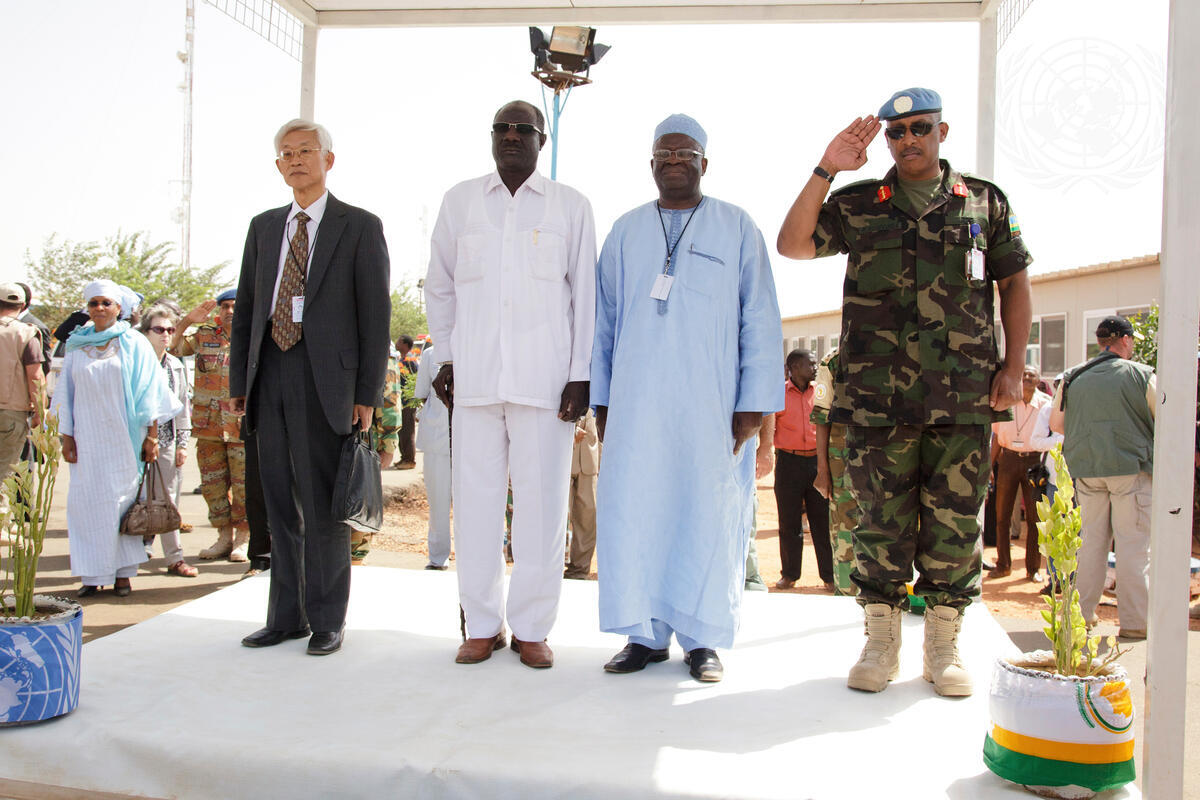 Ibrahim Gambari (second from right), Joint Special Representative for the A.U.-UN Hybrid Operation in Darfur (UNAMID), and UNAMID Force Commander Lieutenant General Patrick Nyamvumba (right) arrive at the Fourth Special Envoys Retreat in El Geneina, West Darfur, Sudan. With them are Lui Guijin (left), Ambassaodor of China and Special Envoy to Sudan, and Jaffer Abdulhakim, Wali of West Darfur.