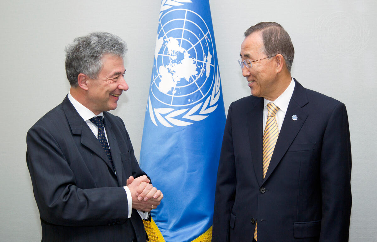 Secretary-General Ban Ki-moon (right) meets with Thomas Mayr-Harting, new European Union Head of Delegation.