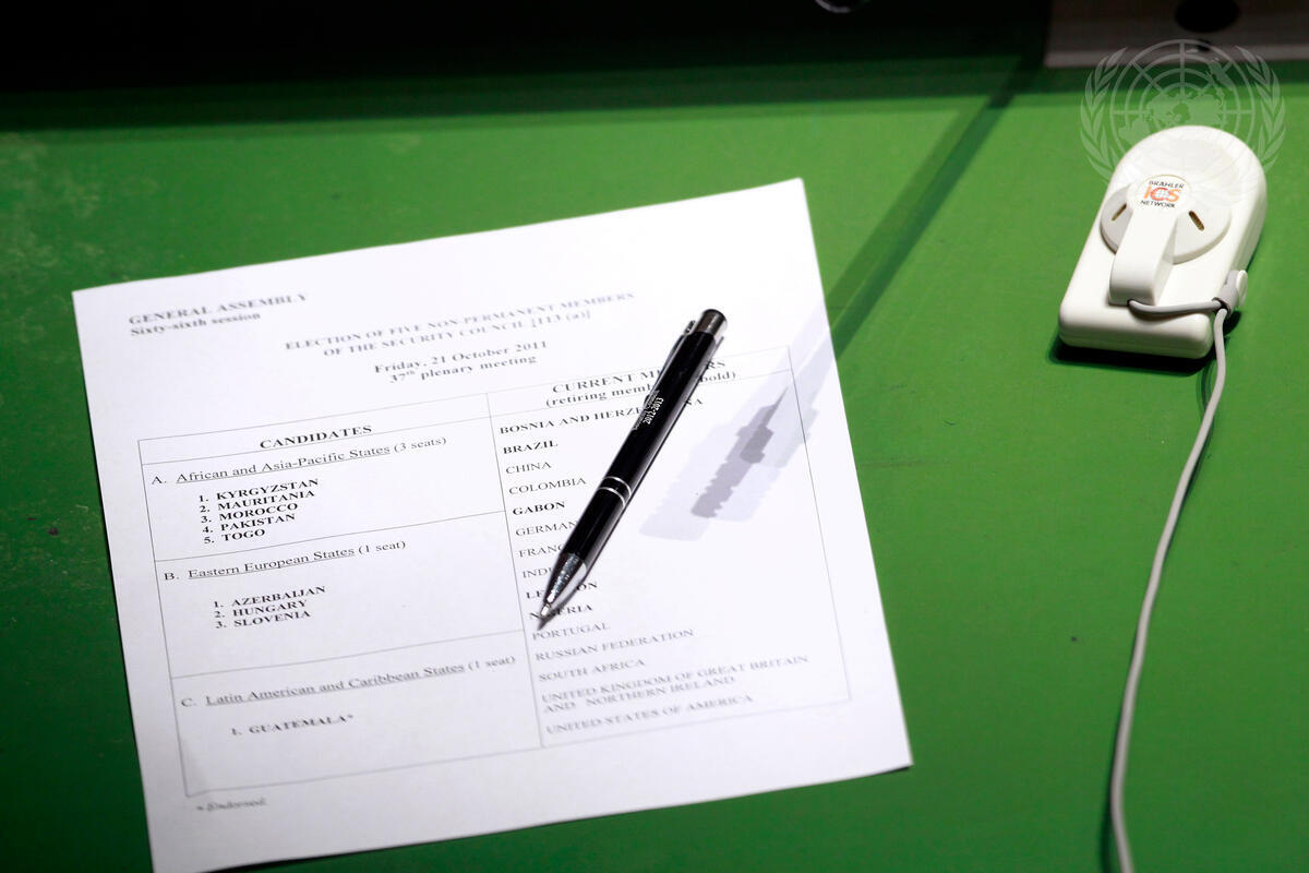 A close-up of the list of Member States competing in the General Assembly for five non-permanent seats on the Security Council. The winners will each serve on the Council for two-year terms beginning 1 January 2012.