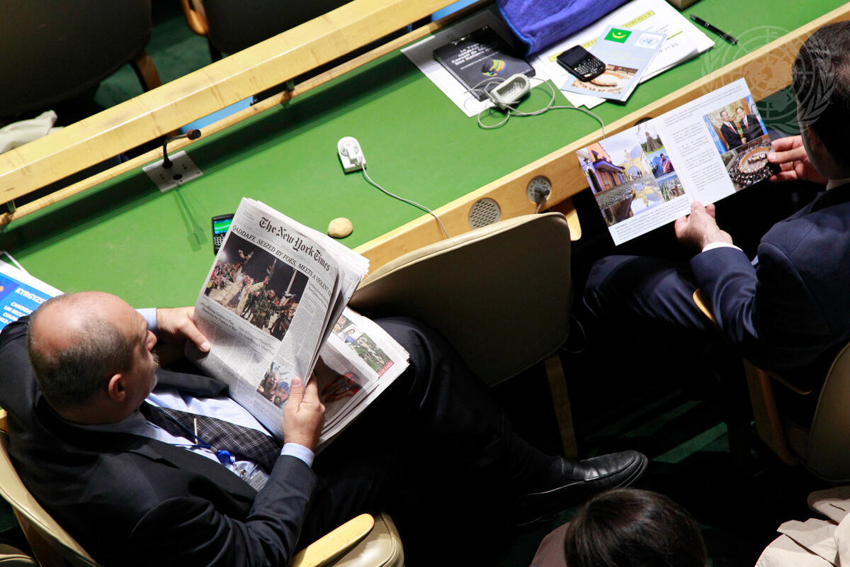 A delegate reads the New York Times, featuring a front-page story on the demise of Colonel Muammar al-Qadhafi, as a colleague looks through a leaflet prepared by a Member State competing for a seat on the Security Council, during the General Assembly’s election of five Member States to two-year seats on the Council.