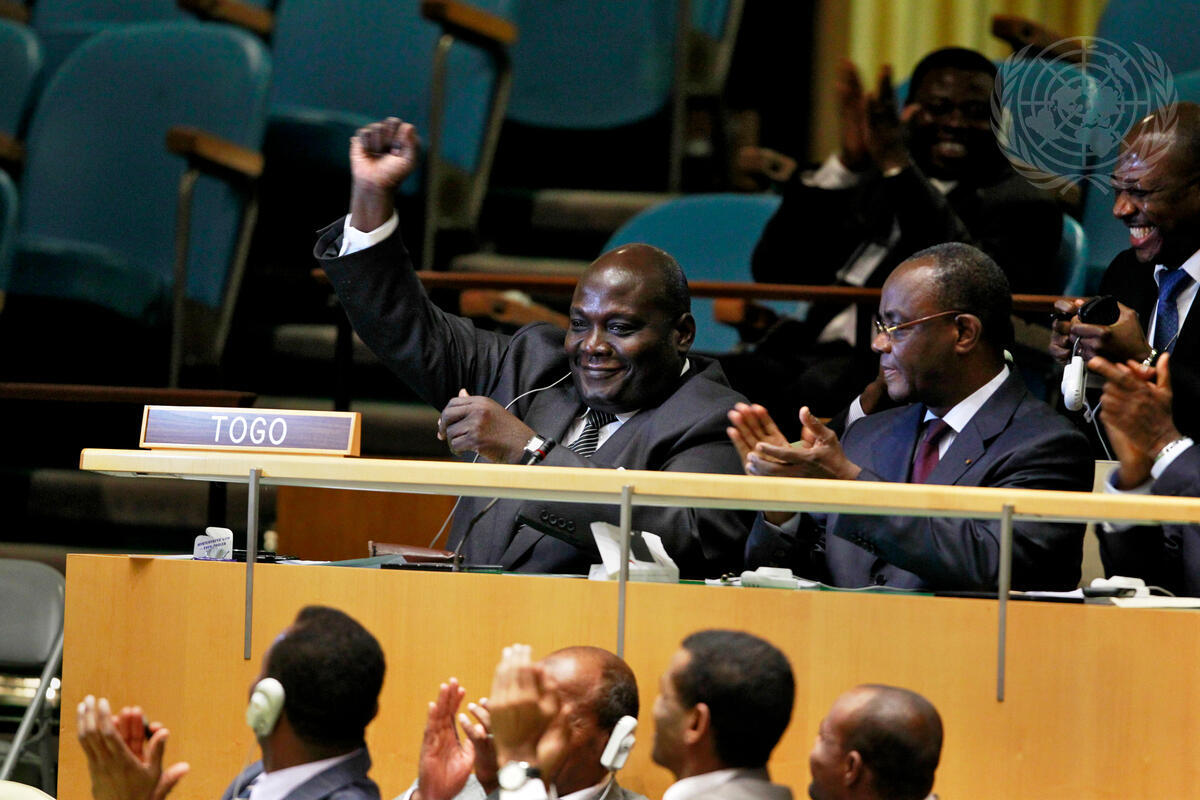 Elliot Ohin (centre left), Minister for Foreign Affairs of Togo, celebrates as his country is elected by the General Assembly as one of five non-permanent members of the Security Council. Along with Guatemala, Morocco and Pakistan, and a fifth member yet to be determined, Togo will serve on the Council for a two-year term beginning 1 January 2012.