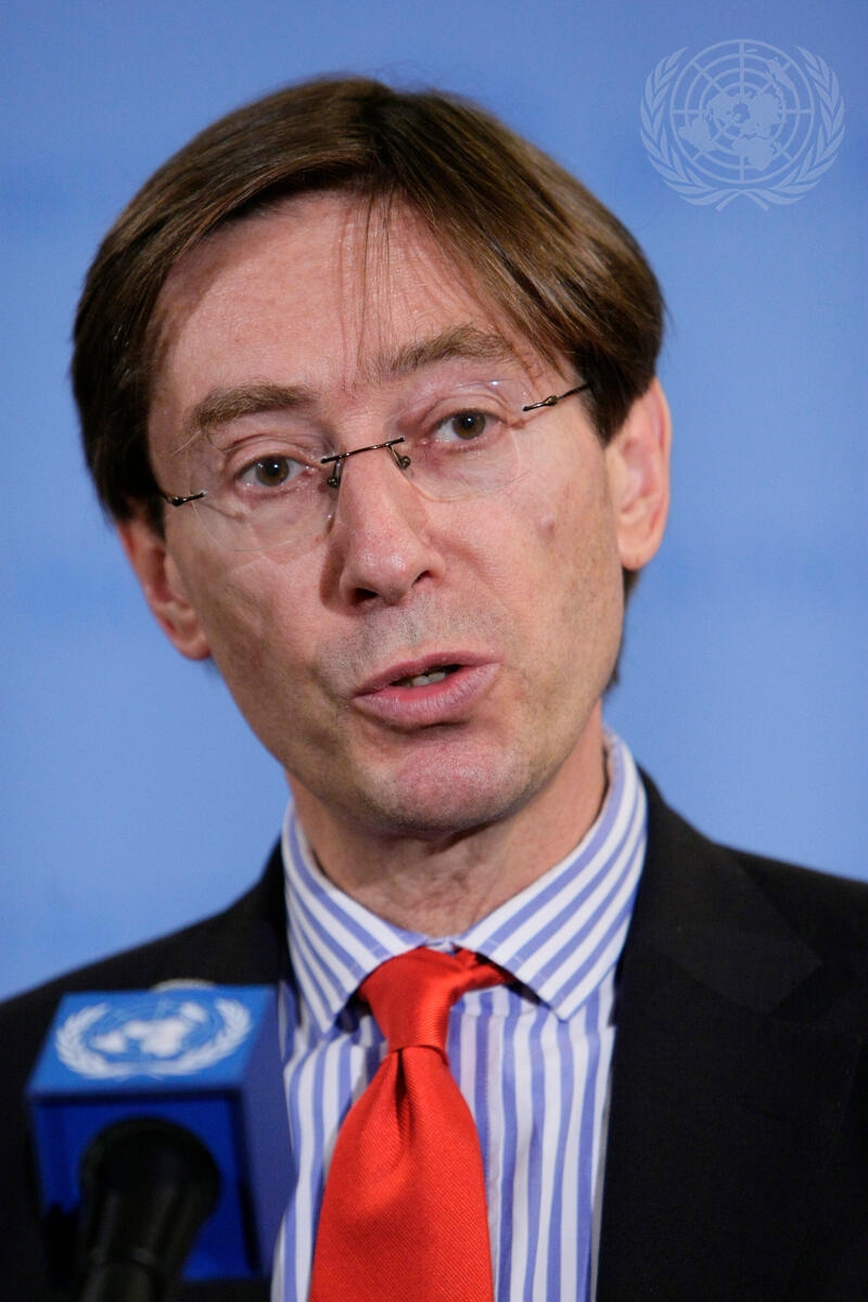 Peter Wittig, Permanent Representative of Germany to the UN, speaks to reporters following the Security Council’s adoption of resolution 2014 (2011), demanding an end to the attacks on civilians by Yemeni authorities during months of political conflict in that nation. The resolution also supports a peaceful transition of power from Ali Abdullah Saleh, Yemen’s president.
