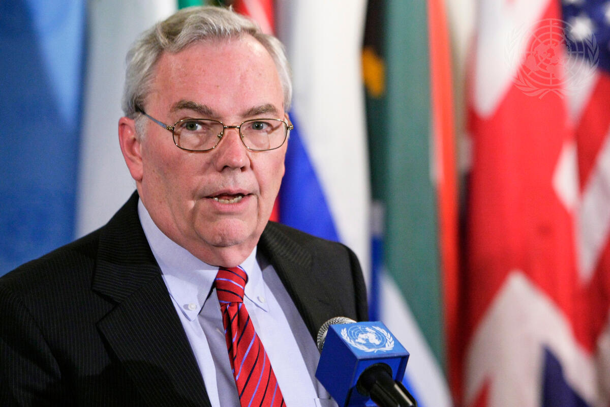 B. Lynn Pascoe, Under-Secretary-General for Political Affairs, speaks to reporters following the Security Council’s adoption of resolution 2014 (2011), demanding an end to the attacks on civilians by Yemeni authorities during months of political conflict in that nation. The resolution also supports a peaceful transition of power from Ali Abdullah Saleh, Yemen’s president.