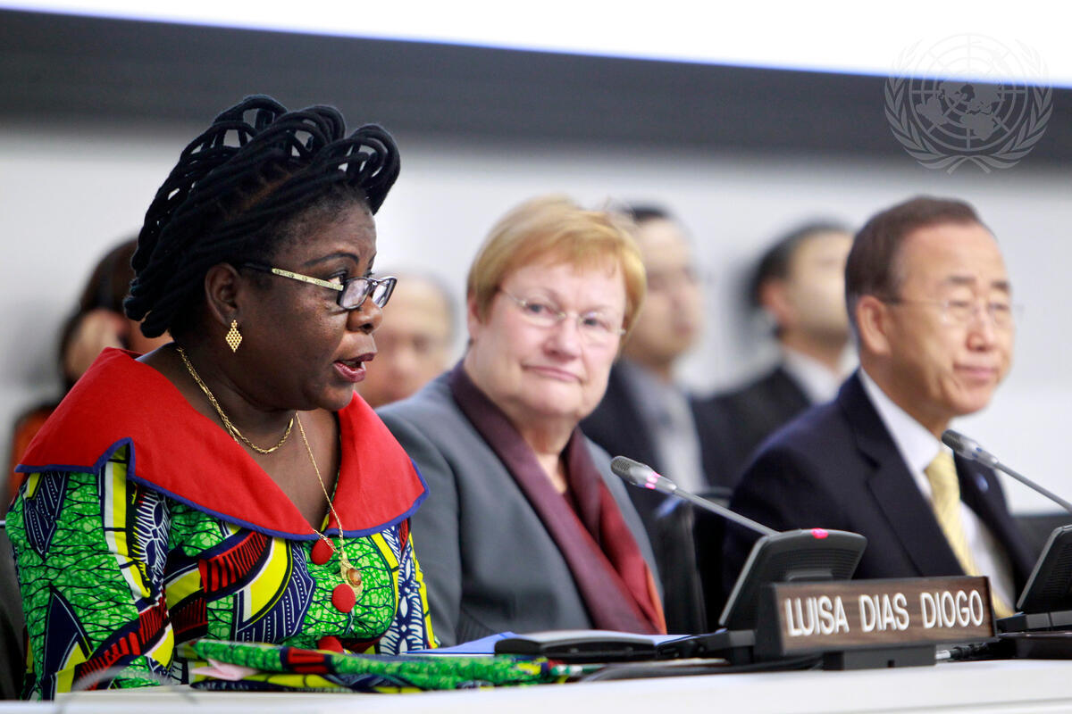 Luisa Dias Diogo (left), former Prime Minister of Mozambique and Member of the Secretary-General’s High-Level Panel on Global Sustainability, speaks during the Panel’s interactive dialogue with the General Assembly. Pictured with here are Tarja Halonen (centre), President of Finland and Panel Co-Chair, and Secretary-General Ban Ki-moon.