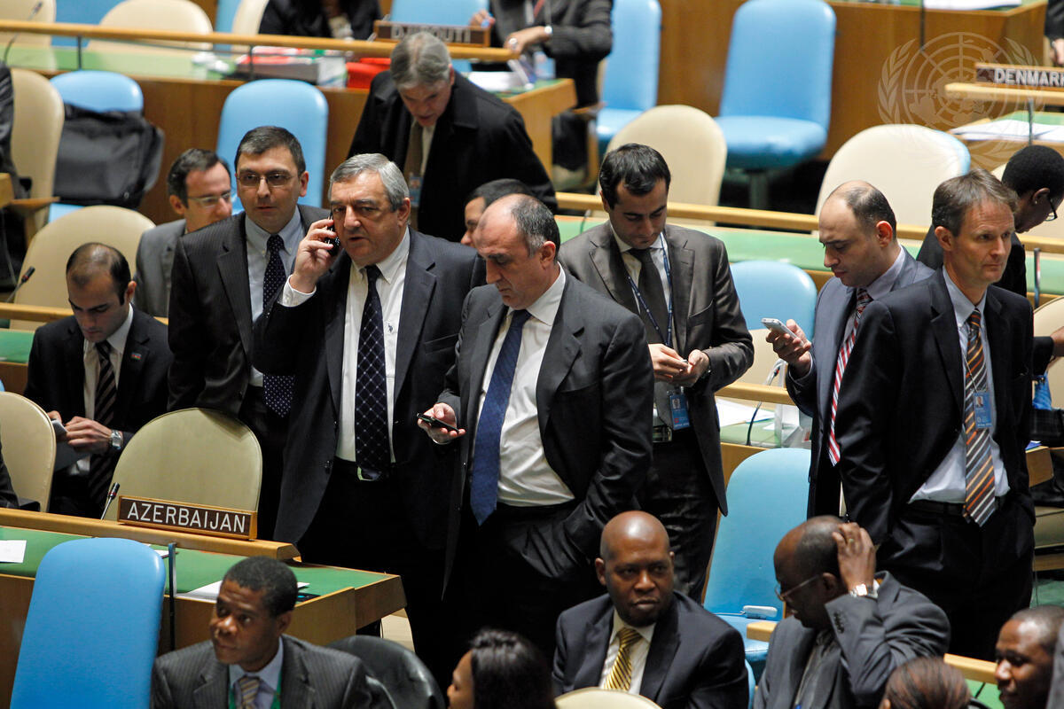 Elmar Maharram oglu Mammadyarov (centre right, in blue tie), Minister for Foreign Affairs of Azerbaijan, Agshin Mehdiyev (centre left), Permanent Representative of Azerbaijan to the UN, and the Azerbaijani delegation, are shown inside the General Assembly Hall during their contest with Slovenia for a fifth and final non-permanent, two-year seat on the Security Council, beginning in 2012. Azerbaijan ultimately won the seat, capturing a required two-thirds majority vote in the Assembly.