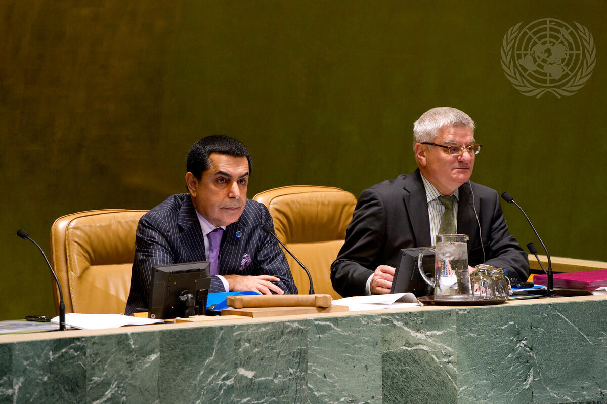 Nassir Abdulaziz Al-Nasser (left), President of the sixty-sixth session of the General Assembly, chairs a meeting of the Assembly at which Members considered the annual reports of the International Criminal Court (ICC) and International Court of Justice (ICJ). Next to Mr. Al-Nasser is Ion Botnaru, Director of the General Assembly and the Economic and Social Council (ECOSOC) Affairs Division.