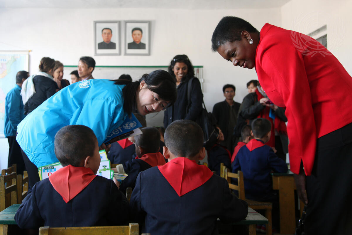 Valerie Amos (right), Under-Secretary-General for Humanitarian Affairs, visits a classroom in the Provincial Boarding School supported by the UN Children’s Fund (UNICEF) and the World Food Programme (WFP) in Hamhung City, Democratic People’s Republic of Korea (DPRK).
