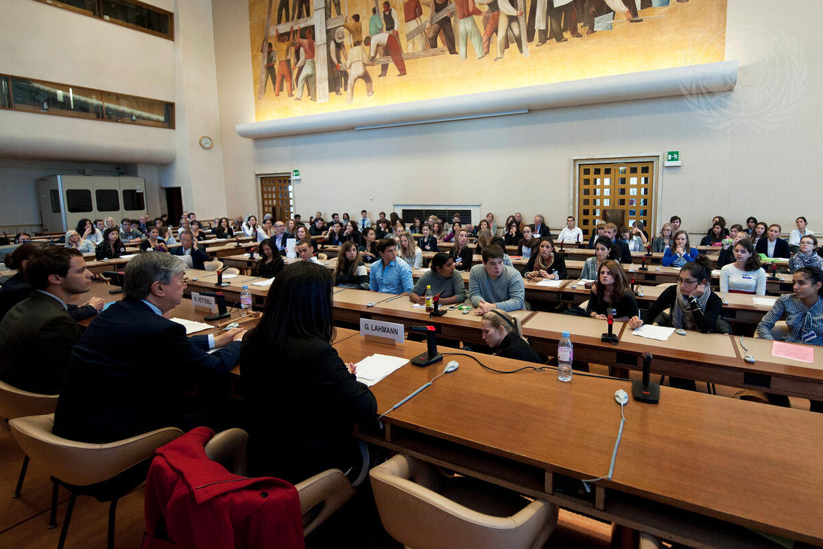 A view inside the special event held at the UN offices in Geneva, Switzerland, with the Geneva International Model United Nations (GIMUN), to commemorate the 2011 United Nations Day (annually 24 October), marking the sixty-sixth anniversary of the signing of the organization’s charter. Pictured second from left is Kassym-Jomart Tokayev (back to camera), Director-General of the United Nations Office at Geneva (UNOG).