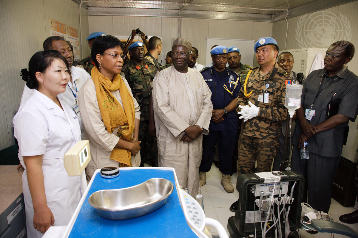 Ibrahim Gambari (centre), Joint Special Representative for the African Union-United Nations Hybrid Operation in Darfur (UNAMID) opens the level II hospital. Aïchatou Mindaoudou Souleymane, Deputy Joint Special Representative for Political Affairs in UNAMID, is third from left. The hospital is operated by the Mongolian UNAMID contingent in Kabkabiya and it serves UN personnel in the region and local Darfuris, providing them with emergency care, dental services, pharmaceutical services and other forms of treatment.