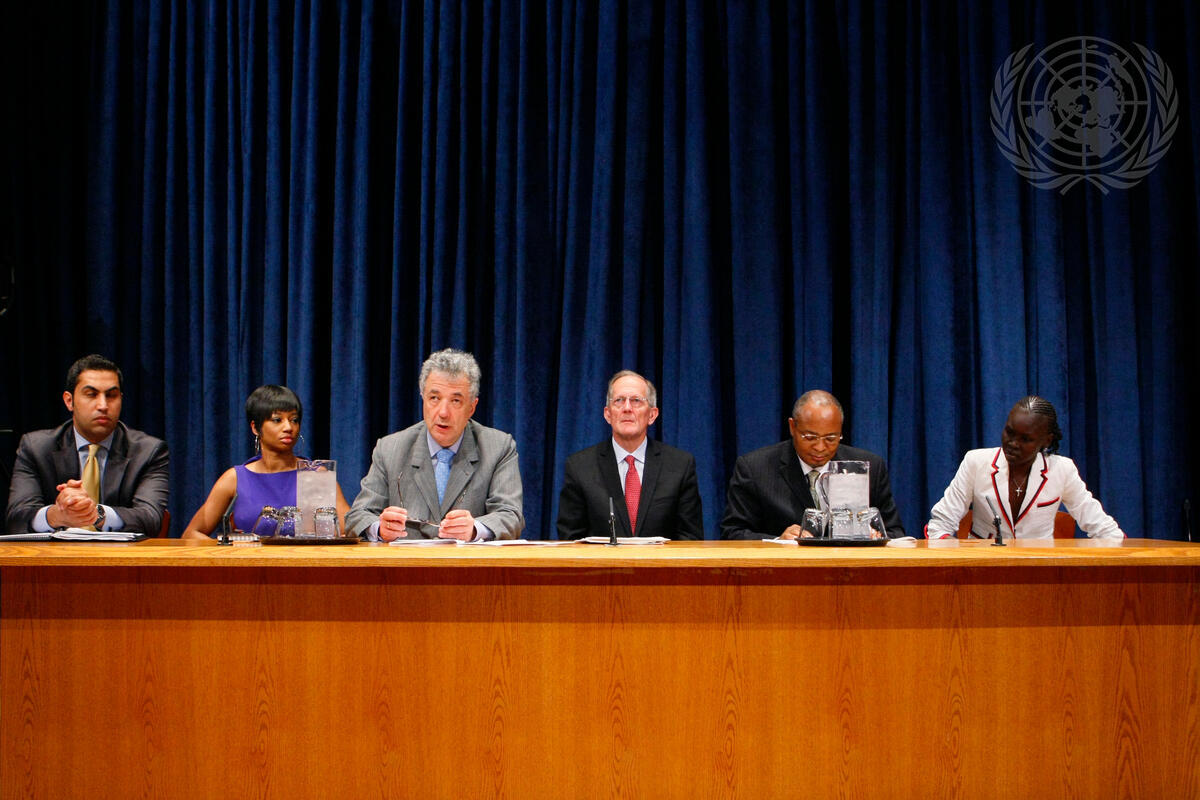 A wide view of the press conference held during the General Assembly High-Level Meeting on Youth, photographed as Thomas Mayr-Harting, Permanent Representative of Austria to the United Nations, speaks. From left to right: Ahmad Alhendawi, youth activist; Monique Coleman, actress and “Youth Champion” for the International Year of Youth; Mr. Mayr-Harting; Joseph Deiss, President of the sixty-fifth session of the General Assembly; Jean-Francis Zinsou, Permanent Representative of Benin to the United Nations; and Alek Wek, model and youth activist.