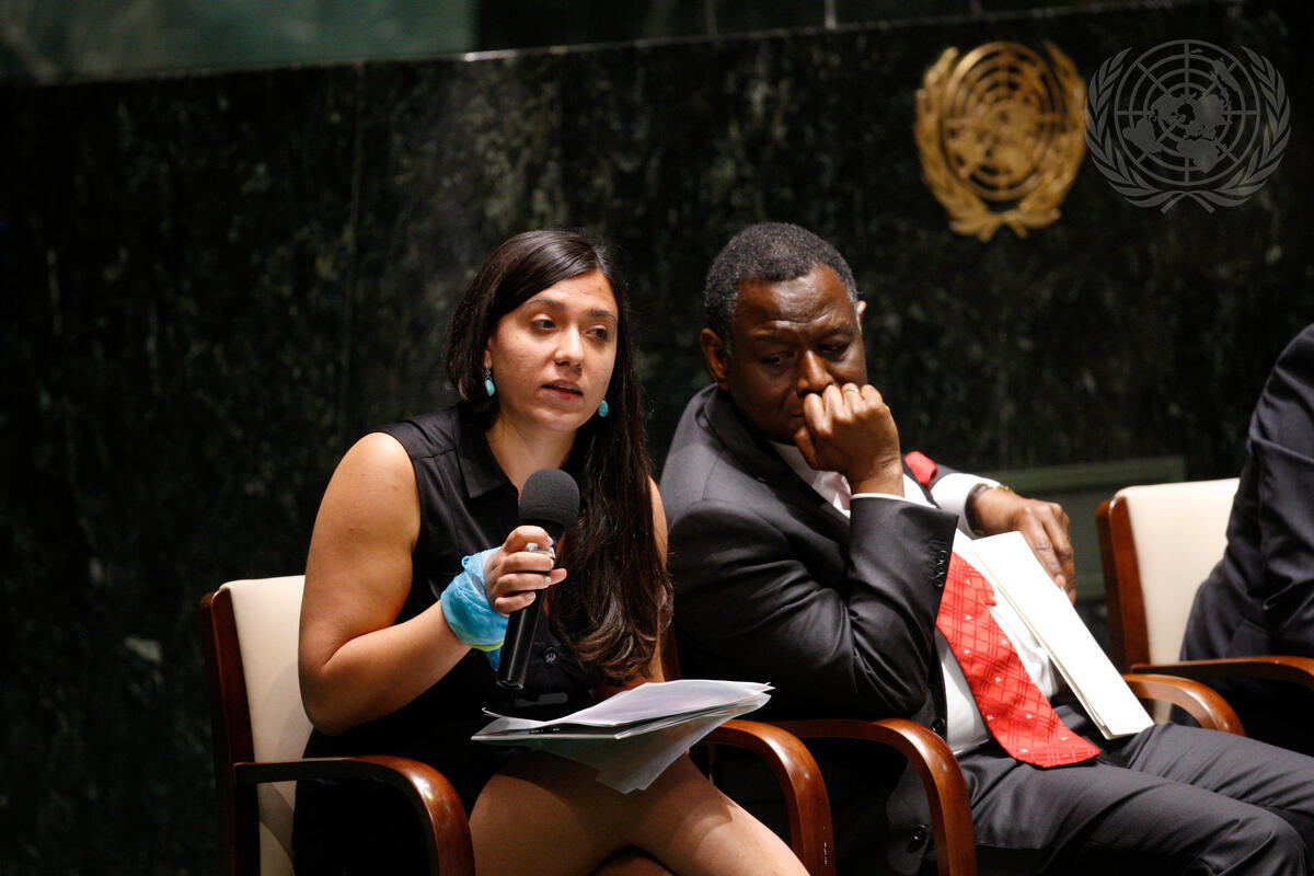 Leila Yasmin Mucarsel, from Argentina, of the CIVICUS World Alliance for Citizen Participation, speaks at the panel discussion held during the General Assembly High-Level Meeting on Youth. Babatunde Osotimehin, Executive Director of the United Nations Fund for Population Activities (UNFPA) is on the right.