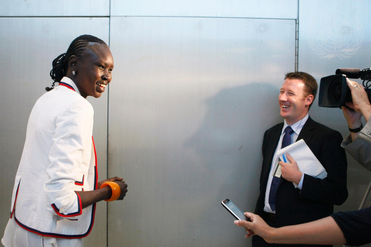 Alek Wek arrives for an interview by the UN News Service, UN Radio and UNTV after her address to the General Assembly High-Level Meeting on Youth. Ms. Wek is a model who helps raise awareness on the situation in Sudan, as well as the plight of refugees worldwide. She also devotes time to the United Nations Children's Fund (UNICEF). Darrin Farrant, Editor of the UN News Centre, is pictured on right.