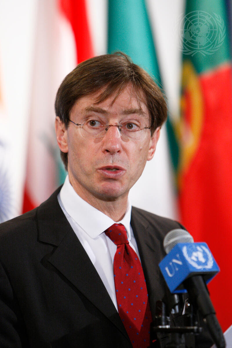 Peter Wittig, President of the Security Council for July 2011 and Permanent Representative of Germany to the United Nations, speaks to journalists after the Security Council meeting on the Sudan.