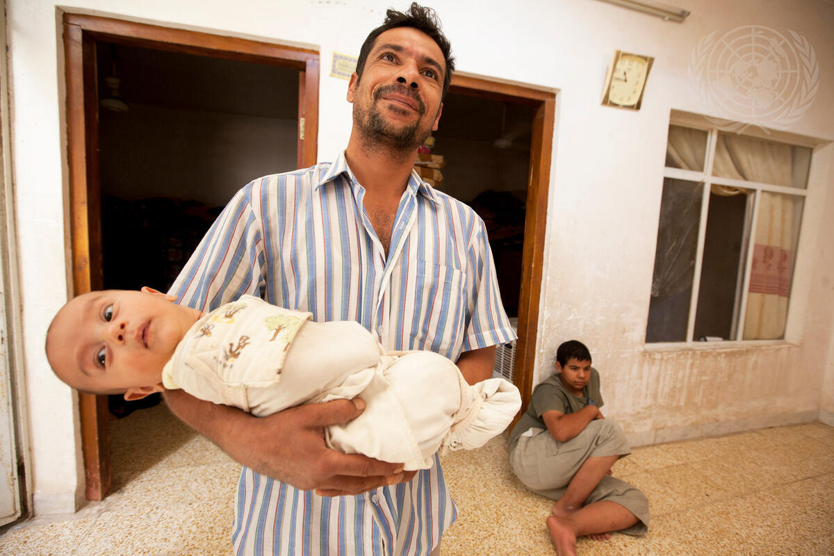 The Office of the High Commissioner for Refugees (UNHCR) through its local implementing partner Public Aid Organization (PAO) provides food and non-food items, as well as legal protection and counselling for Internally Displaced Persons (IDPs), such as this man seen holding a baby.