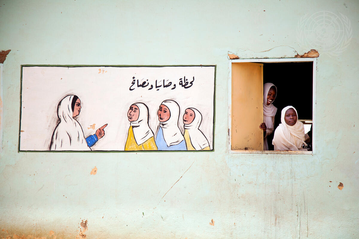Students of the Alfaki Abdallah Albigawi Basic Level School for girls in El Fasher (North Darfur) participate in the programme to commemorate Nelson Mandela International Day (18 July), organized by the African Union – United Nations Hybrid Operation in Darfur (UNAMID).