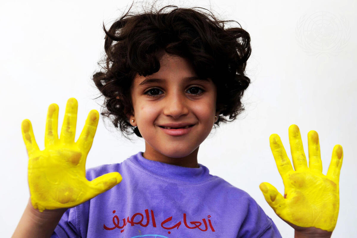 A girl shows the paint used by the Palestinian children to break another Guinness World record for the largest handprinted artwork produced (5,922.2 square meters), at the event organized by the United Nations Relief and Works Agency (UNRWA) in Khan Younis, southern Gaza Strip.