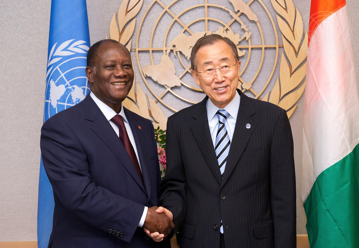 Secretary-General Ban Ki-moon (right) meets with Alassane Dramane Ouattara, President of Côte d'Ivoire.