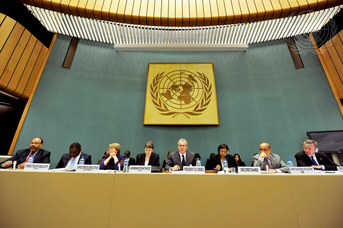 A view of the Operational Activities Segment of the Economic and Social Council (ECOSOC), chaired by Gonzalo Gutiérrez Reinel (fifth from left), ECOSOC Vice-President. The Executive Heads of UN Funds and Programmes participate in the discussion. They include Martin Mogwanja (first left), Deputy Executive Director of the United Nations Children's Fund (UNICEF); Babatunde Osotimehin (second left), Executive Director of the United Nations Fund for Population Activities (UNFPA); Michelle Bachelet (third left), Under-Secretary-General for Gender Equality and the Empowerment of Women (UN Women); Helen Clark (fourth left), Administrator of the United Nations Development Programme (UNDP); and Ramiro Lopes da Silva (second right), Deputy Executive-Director of the World Food Programme (WFP).