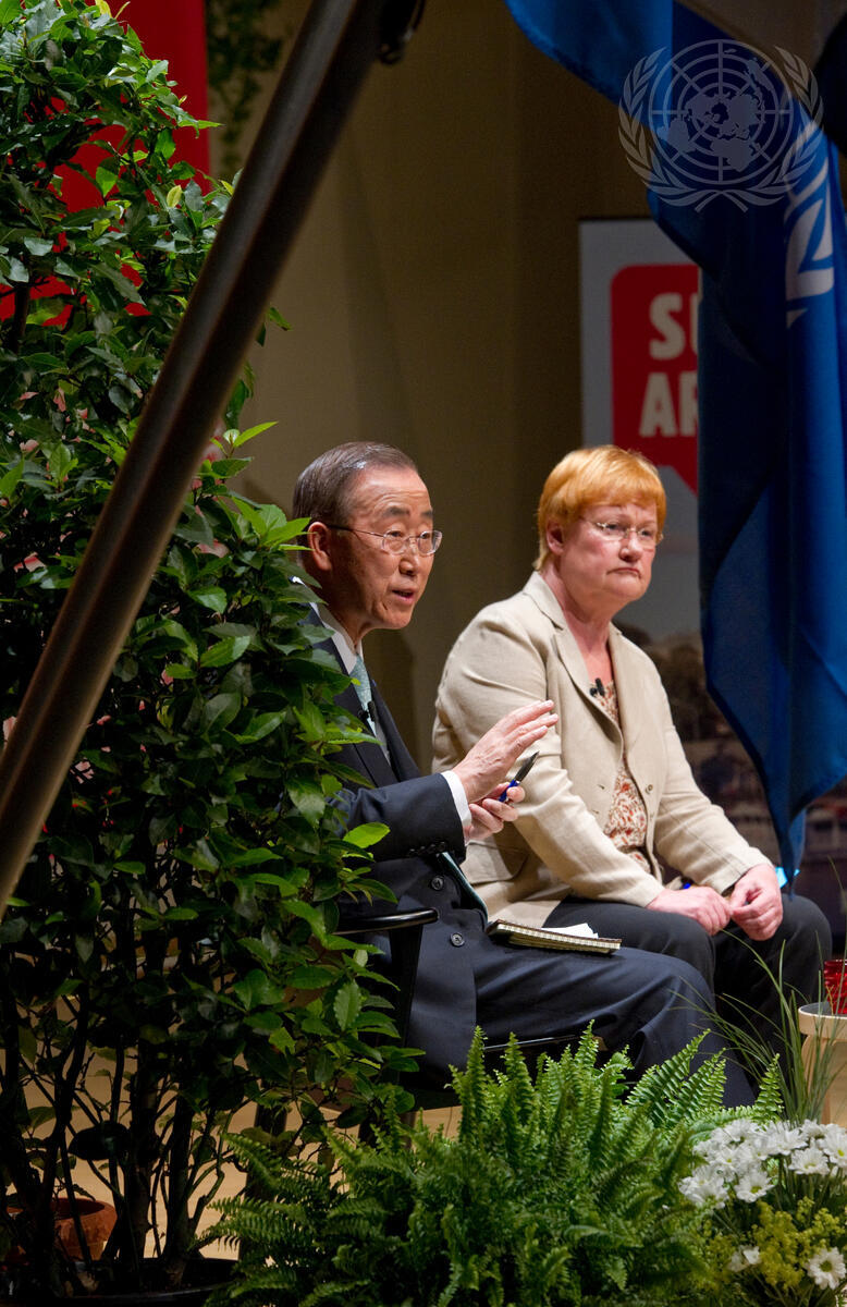 Secretary-General Ban Ki-moon (left) speaks at the Forum on Sustainable Development, while Tarja Halonen, President of Finland, listens. He calls for a revolution in favour of sustainable development, in which we could have a green economy, driven by business, supported by governments, and embraced by citizens. The discussions are in preparation for the Fourth UN Conference on Sustainable Development, or Rio+20, which will be held in the Brazilian city in June 2012.
