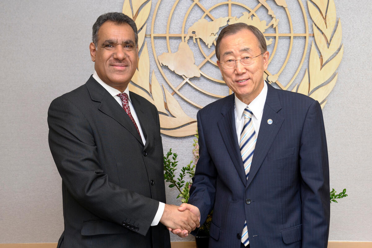 Tawfeeq Ahmed Almasoor, Permanent Representative of Bahrain to the United Nations, pays a farewell call on Secretary-General Ban Ki-moon (right).