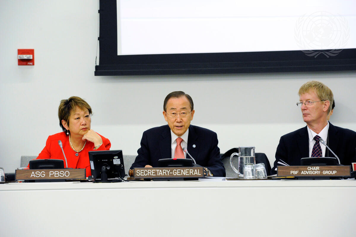 Secretary-General Ban Ki-moon (centre) addresses the opening of the Peacebuilding Fund (PBF) Donors Conference Stakeholder Event. He is flanked by Judy Cheng-Hopkins (left), Assistant Secretary-General and Head of the Peacebuilding Support Office and Dan Smith, Chair of the PBF Advisory Group.