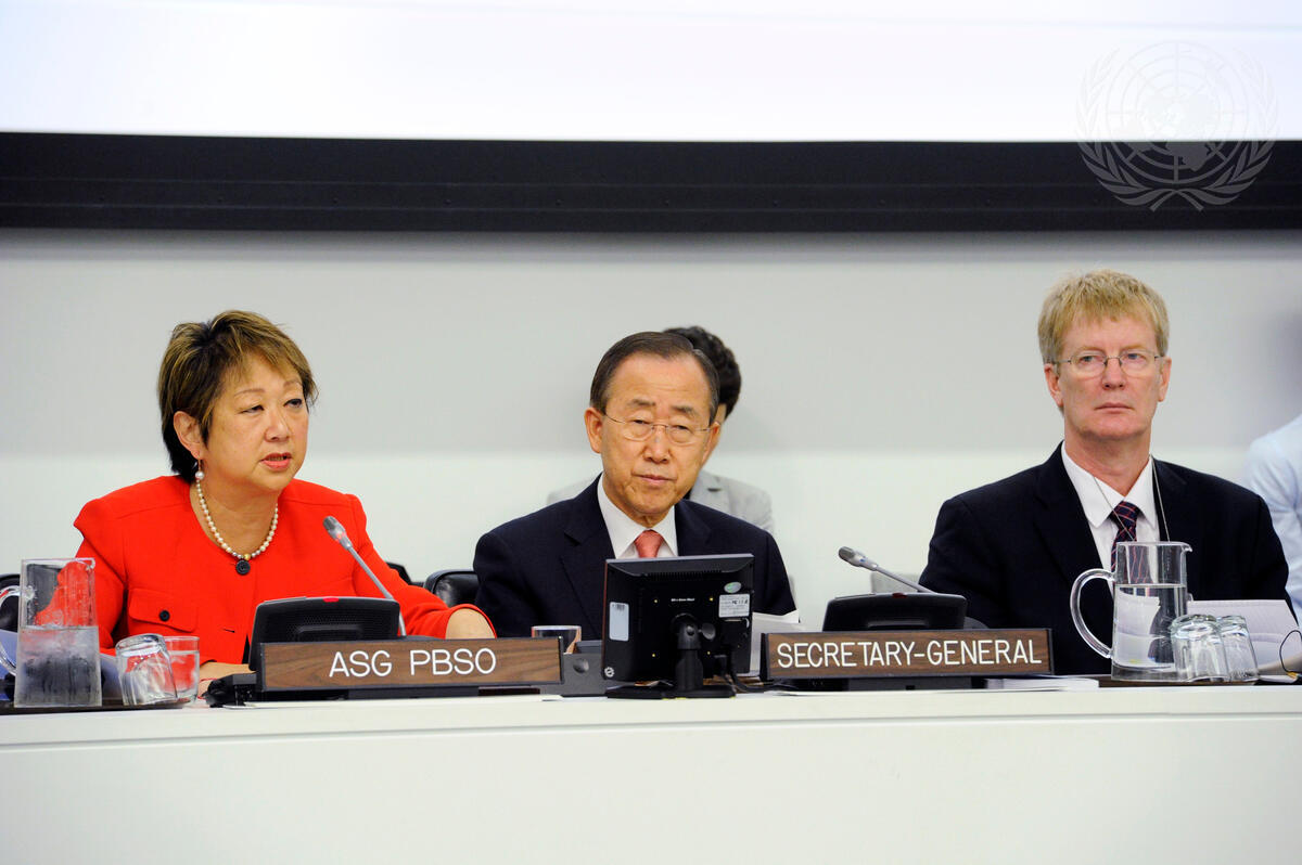 Judy Cheng-Hopkins (left), Assistant Secretary-General and Head of the Peacebuilding Support Office, addresses the opening of the Peacebuilding Fund (PBF) Donors Conference Stakeholder Event. She is joined by Secretary-General Ban Ki-moon (centre) and Dan Smith, Chair of the PBF Advisory Group.