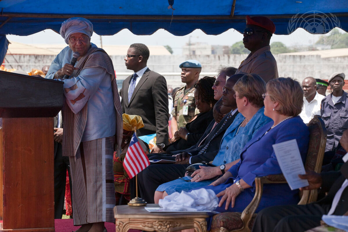 Liberian President Ellen Johnson-Sirleaf (at podium) addresses Michelle Bachelet (right), Executive Director of UN Women, and Ellen Margrethe Løj (second from right), Special Representative of the Secretary-General for Liberia, at a celebration of International Women’s Day at Antoinette Tubman Stadium in Monrovia.