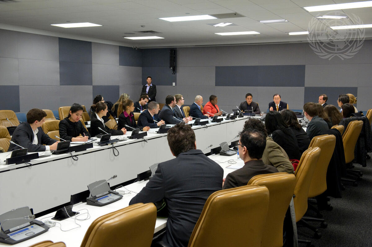 Secretary-General Ban Ki-moon (head table, centre) meets with students from Harvard University’s Kennedy School of Government.