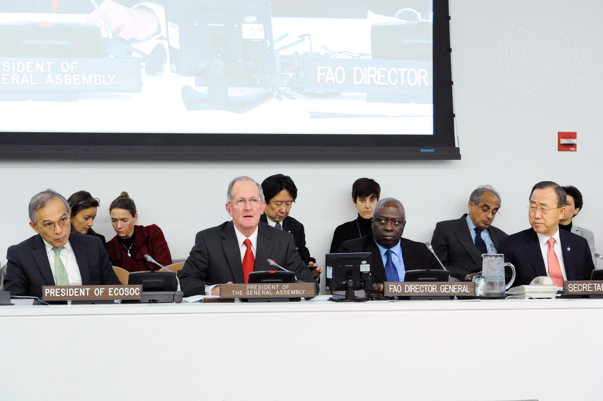 Joseph Deiss (second from lef), President of the sixty-fifth session of the General Assembly, addresses a special ceremony organized by the UN Food and Agriculture Organization (FAO) in observance of World Food Day, on the theme “United against Hunger”. He is joined by (from left): Hamidon Ali, Permanent Representative of Malaysia to the UN and President of the Economic and Social Council (ECOSOC); Jacques Diouf, Director-General of FAO; and Secretary-General Ban Ki-moon.
