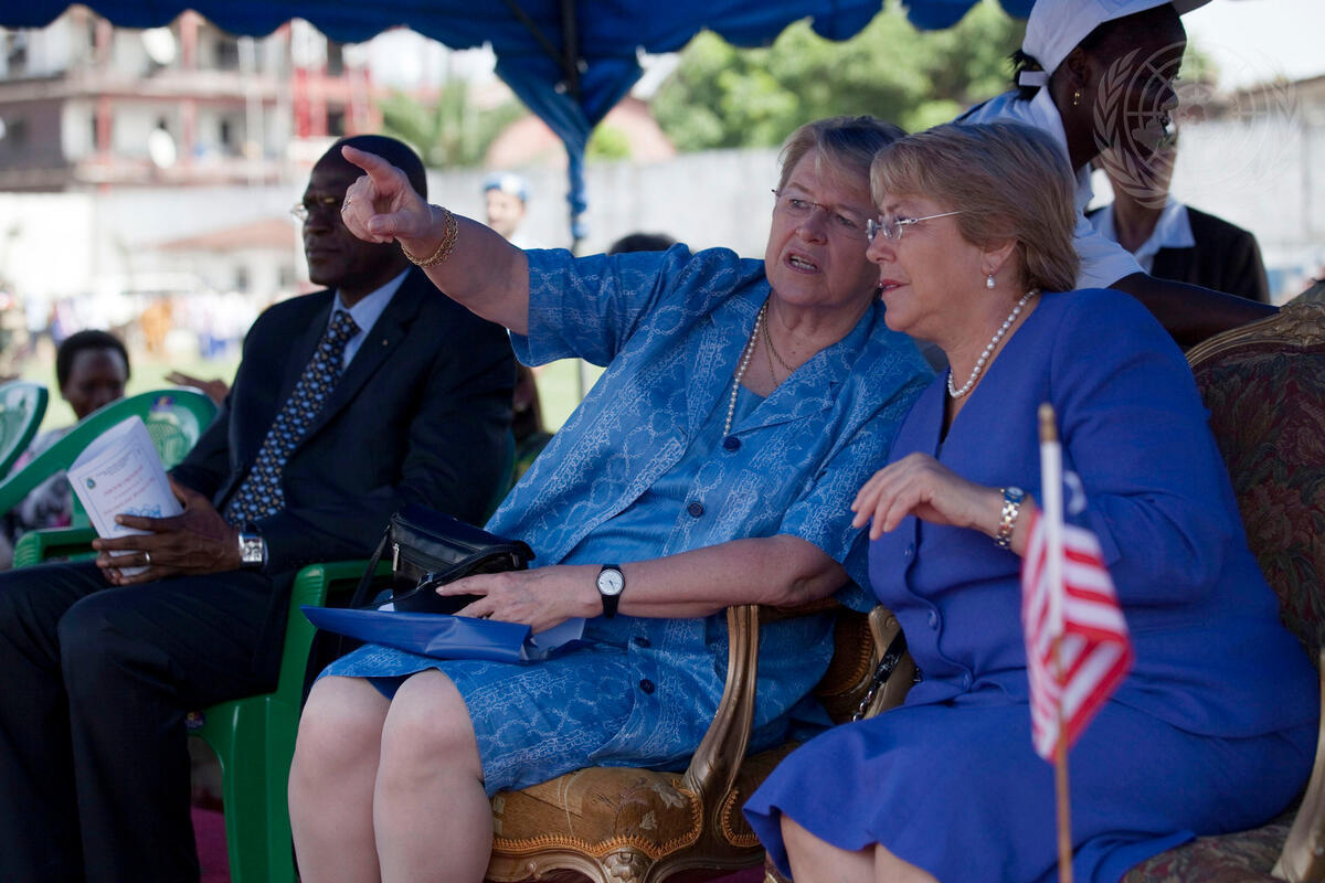 Michelle Bachelet (right), Executive Director of UN Women, and Ellen Margrethe Løj (second from right), Special Representative of the Secretary-General for Liberia, attend a celebration of International Women’s Day at Antoinette Tubman Stadium in Monrovia, Liberia, hosted by President Ellen Johnson-Sirleaf.